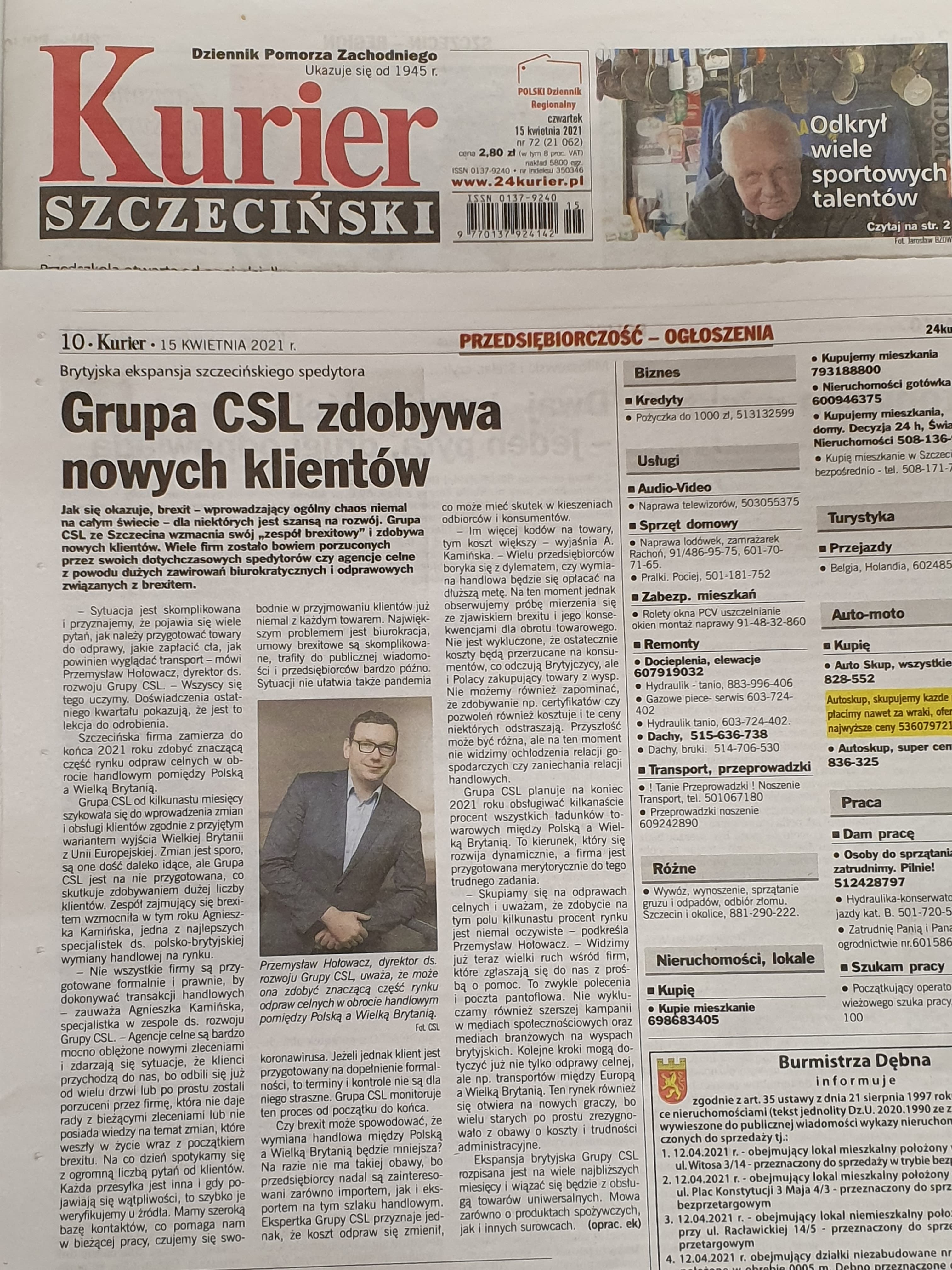 Jak się okazuje Brexit – wprowadzający ogólny chaos niemal na całym świecie – dla niektórych jest szansą do zaistnienia i zdobycia nowych klientów. Grupa CSL wzmacnia swój „zespół Brexitowy” i zdobywa nowych klientów. Wiele firm zostało porzuconych przez swoich dotychczasowych spedytorów czy agencje celne z powodu dużych zawirowań biurokratycznych i odprawowych związanych z Brexitem. – Sytuacja jest skomplikowana i przyznajemy, że pojawia się wiele pytań jak należy przygotować towary do odprawy, jakie zapłacić cła, jak powinien wyglądać transport. Wszyscy się tego uczymy. Doświadczenia ostatniego kwartału pokazują, że jest to lekcja do odrobienia – mówi Przemysław Hołowacz, dyrektor ds. rozwoju Grupy CSL. Szczecińska firma zamierza do końca 2021 roku zdobyć znaczącą część rynku odpraw celnych w obrocie handlowym pomiędzy Polską, a Wielką Brytanią.
